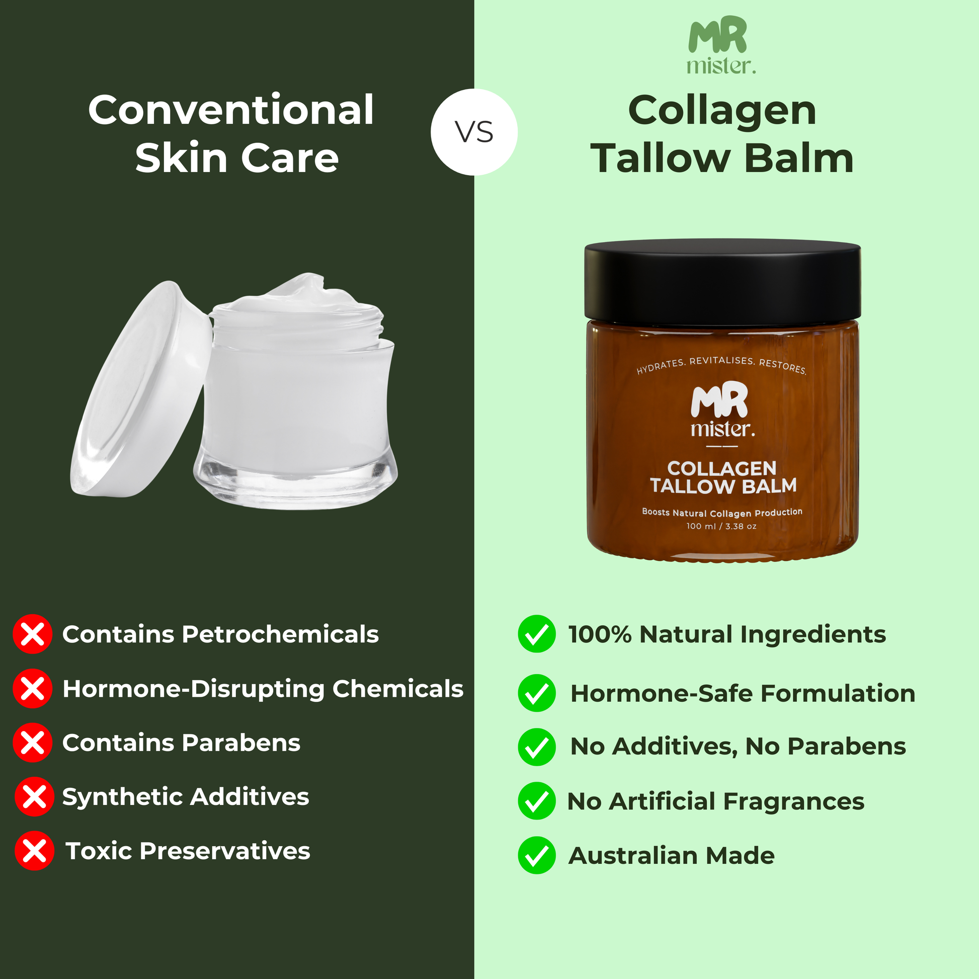 Because big pharma has transformed skincare into quick fixes that mask symptoms instead of supporting your skin's foundation. The solution isn't another chemical treatment. It's supporting your skin's natural structure with ingredients it actually recognises.OUR SCIENCE: THE POWER OF COLLAGEN + BEEF TALLOW